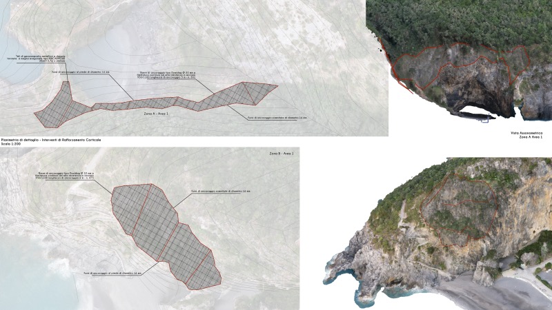 Intervento di rafforzamento corticale realizzato mediante chiodature con maglia 2,5x2,5 m con barre in acciaio tipo Dywidag a filettatura continua con un diametro minimo pari a 32 mm ed una lunghezza non inferiore a 5,0 m, al fine di consolidare le pareti rocciose e la stesa di un rivestimento flessibile ad alta resistenza e a elevata durabilità in geocomposito costituito da rete metallica a doppia torsione a maglia esagonale tipo 8x10, tessuta con trafilato di acciaio avente un diametro pari a 2,70/3,70 mm (UNI EN 10223-3) e funi di acciaio aventi un diametro pari a 6/8 mm galvanizzati con lega di Zinco – 5% Alluminio in Classe A in conformità a UNI EN 10244- 2 e ulteriormente protetti con un rivestimento polimerico. Le funi di acciaio saranno intessute, direttamente in produzione, in direzione longitudinale con un interasse pari a 30 cm.